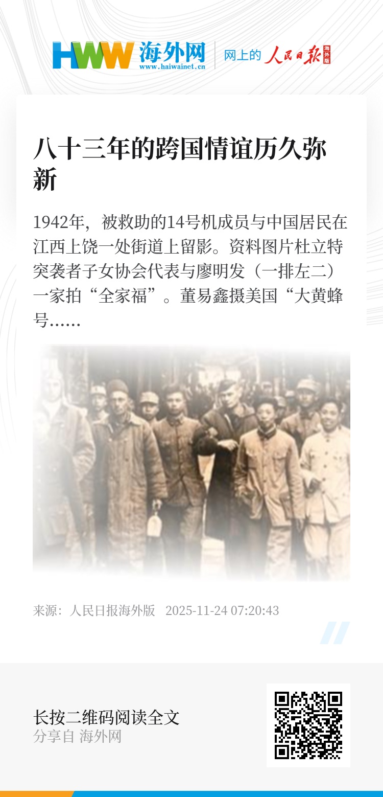 历史的回响,也通过艺术与教育在年轻一代中产生共鸣。在衢州第二中学,一棵于2015年种下的“友谊树”已枝繁叶茂。树旁石碑上,“续‘杜立特突袭’传奇,谱中美友谊新篇章”的寄语熠熠生辉。自2016年起,杜立特突袭者子女协会在该校设立奖学金,并围绕杜立特行动组织英文征文比赛。青春的笔触已在历史的卷轴上书写新的篇章,血火淬炼的中美情谊生生不息。(本报记者 李晓宏 彭训文 李嘉宝 王慧琼)