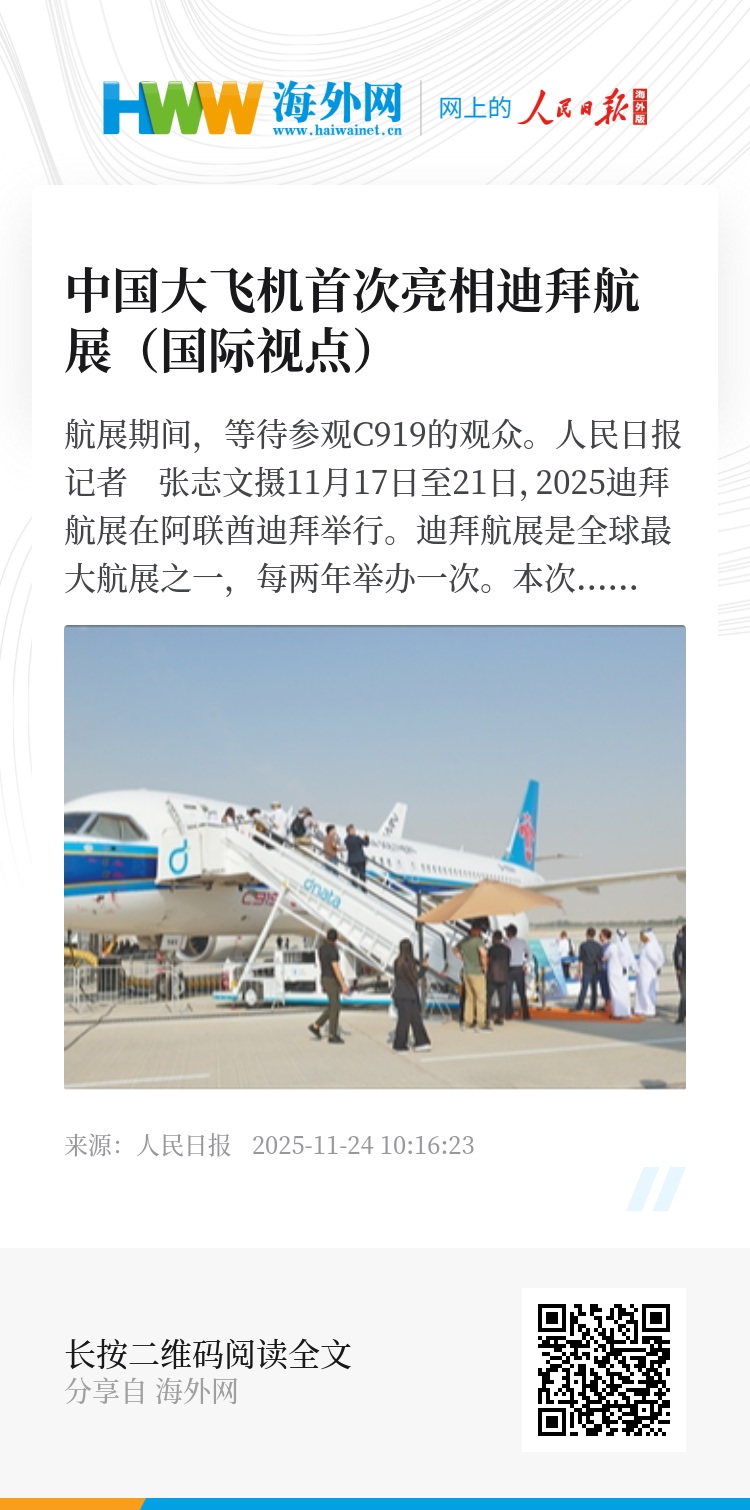 11月17日至21日,2025迪拜航展在阿联酋迪拜举行。迪拜航展是全球最大航展之一,每两年举办一次。本次航展以“未来已来”为主题,集中展示全球航空航天业在可持续发展、人工智能、太空探索、智能交通等领域的前沿成果。来自40余个国家和地区的1500多家航空航天及军工企业参展,200多架各式飞机亮相展会。中国商用飞机有限责任公司和中国南方航空公司各携一架C919飞机参展,受到广泛关注。此外,还有近百家中国内地航空相关企业展示了无人机、电动垂直起降飞行器、飞机发动机等产品,展现了中国制造的创新活力。