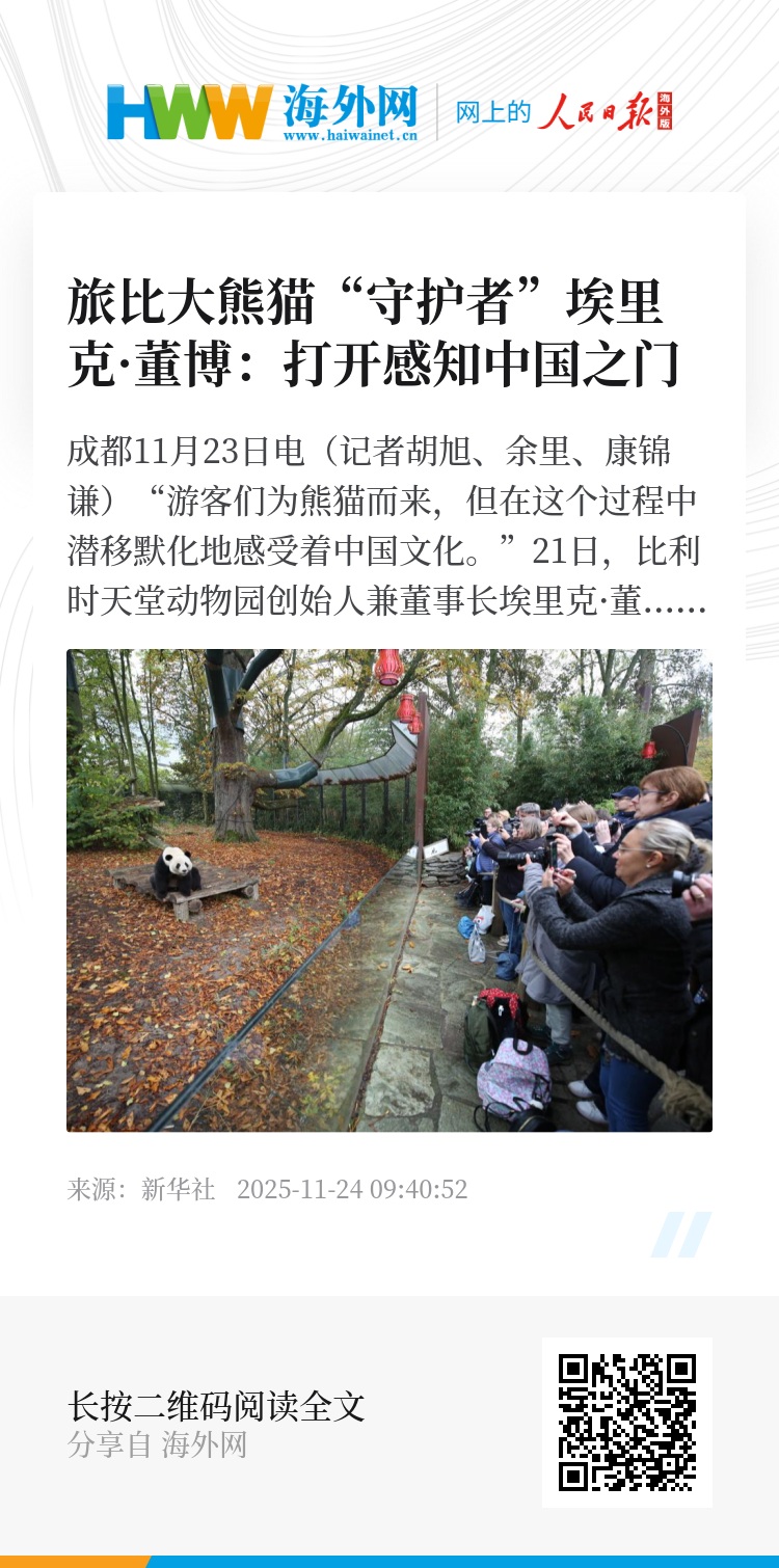 新华社成都11月23日电(记者胡旭、余里、康锦谦)“游客们为熊猫而来,但在这个过程中潜移默化地感受着中国文化。”21日,比利时天堂动物园创始人兼董事长埃里克·董博在2025全球熊猫伙伴大会间隙接受记者采访时表示,“我十分乐于借助大熊猫的魅力,为各国人民打开感知中国文化的心灵之门。”