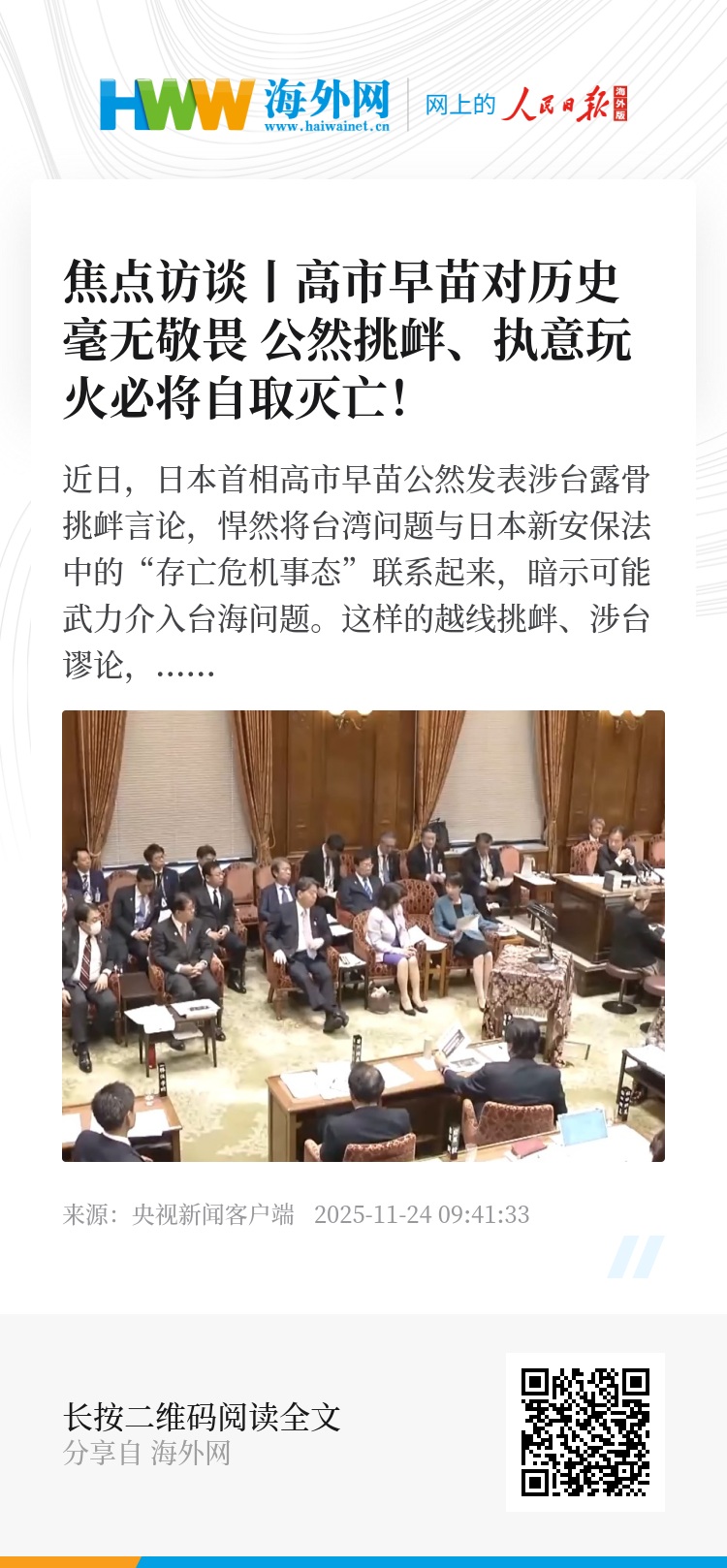 高市早苗有关言论严重违反国际法和国际关系基本准则,严重破坏战后国际秩序,这是对14亿多中国人民和曾遭受日本侵略的亚洲国家人民的公然挑衅。台湾是中国的神圣领土,如何解决台湾问题是中国人自己的事,不容任何外来干涉。中方绝不允许日本右翼势力开历史倒车,绝不允许外部势力染指中国台湾地区,绝不允许日本军国主义死灰复燃,将同各方一道维护一个中国原则的国际共识,共同维护二战胜利成果。
