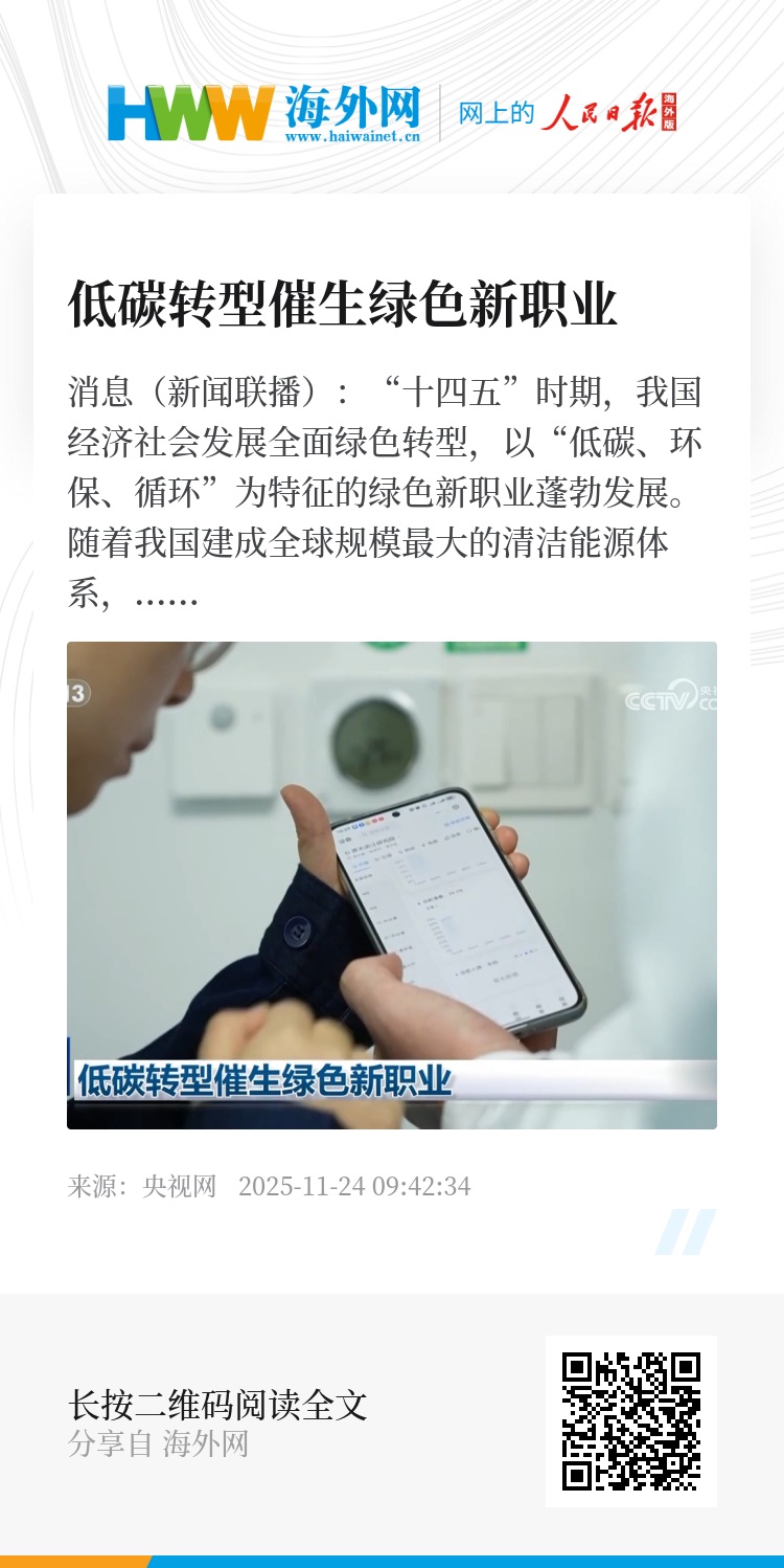 央视网消息(新闻联播):“十四五”时期,我国经济社会发展全面绿色转型,以“低碳、环保、循环”为特征的绿色新职业蓬勃发展。