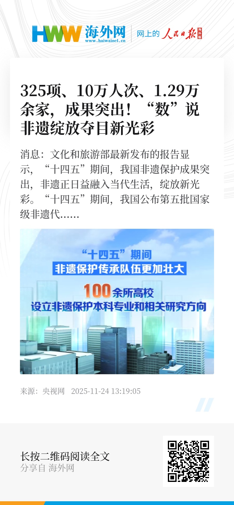 央视网消息:文化和旅游部最新发布的报告显示,“十四五”期间,我国非遗保护成果突出,非遗正日益融入当代生活,绽放新光彩。