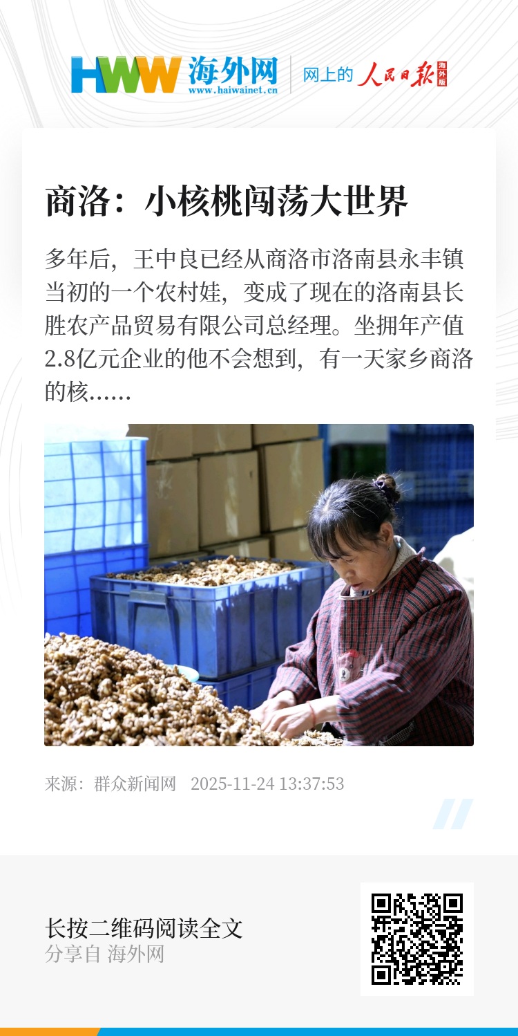 2025年,“洛南核桃”品牌价值达30.03亿元。近3年,洛南核桃搭乘中欧班列出口销售量达5181吨,实现收入1.03亿元。