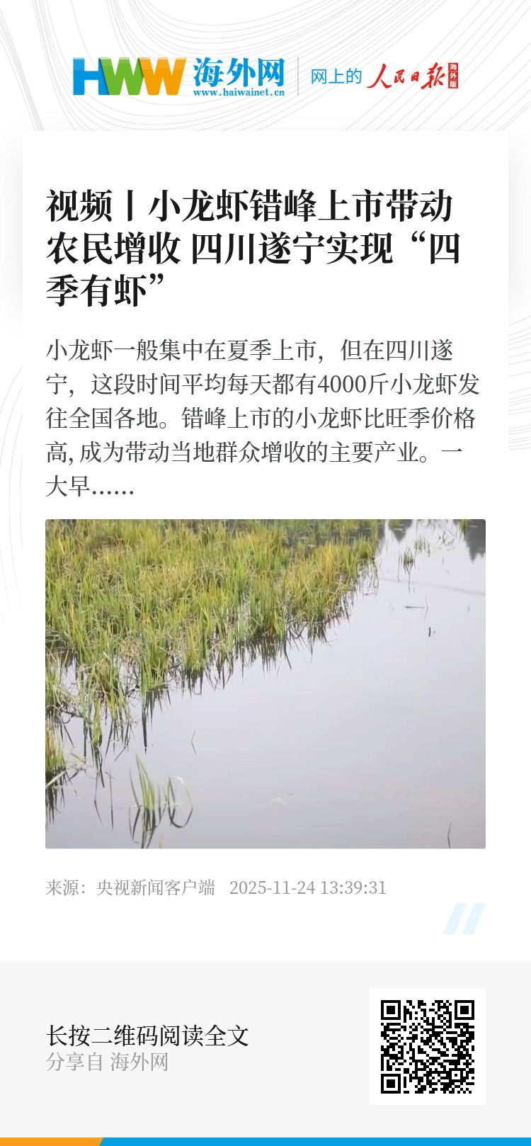 据了解,每年4到6月,是小龙虾生长和捕捞的黄金季节。进入冬季后,若水下温度低于5℃,小龙虾一般会进入冬眠状态。而在川中地区,冬季气温一般在5到10℃,具有反季节养殖小龙虾的天然优势。为了打破小龙虾季节性供应局限,当地通过种植低温水草净化水质,适当提高虾田水位保证水温等方式,营造适合小龙虾生长的环境,实现“四季有虾”。