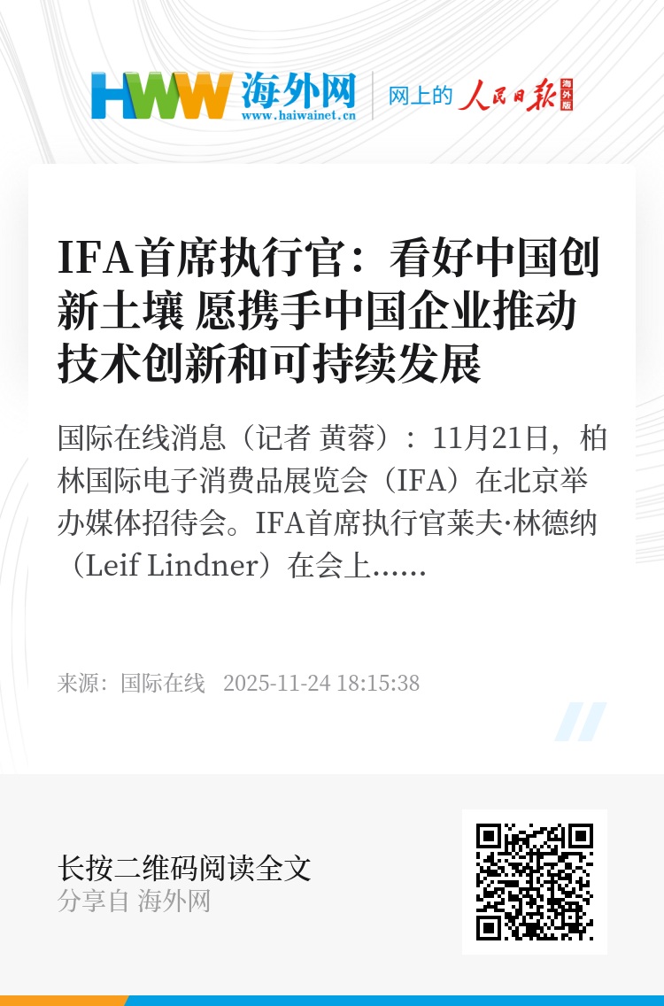 国际在线消息(记者 黄蓉):11月21日,柏林国际电子消费品展览会(IFA)在北京举办媒体招待会。IFA首席执行官莱夫·林德纳(Leif Lindner)在会上回顾了2025年IFA的展会盛况以及明年的筹备工作。会后,莱夫·林德纳接受国际在线记者专访时表示,中国是全球科技行业至关重要的合作伙伴,中国企业的创新实力令他印象深刻,IFA愿携手中国企业,将中国品牌的科技成果和创新故事介绍给全球消费者,共同推动可持续发展,让全球消费者感受科技的美好。