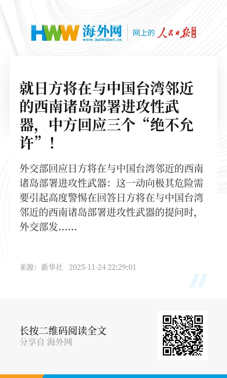 在回答日方将在与中国台湾邻近的西南诸岛部署进攻性武器的提问时,外交部发言人毛宁24日在例行记者会上表示,此举刻意制造地区紧张,挑动军事对立,联系到日本首相高市早苗的涉台错误言论,这一动向极其危险,需要引起周边国家及国际社会的高度警惕。中方绝不允许日本右翼势力开历史倒车,绝不允许外部势力染指中国台湾地区,绝不允许日本军国主义死灰复燃。中方有决心有能力捍卫国家领土主权。