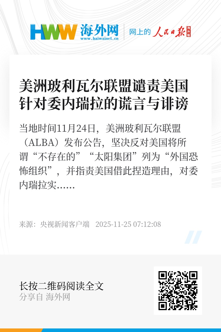 当地时间11月24日,美洲玻利瓦尔联盟(ALBA)发布公告,坚决反对美国将所谓“不存在的”“太阳集团”列为“外国恐怖组织”,并指责美国借此捏造理由,对委内瑞拉实施敌对行动、推动所谓“政权更迭”。