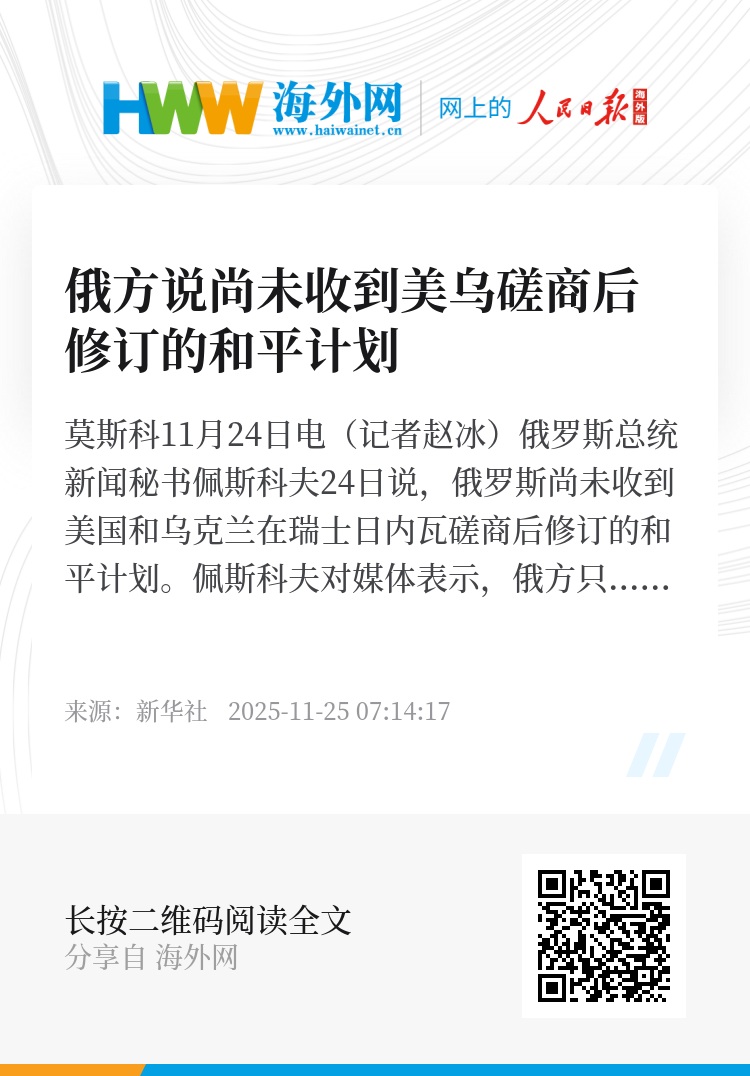 新华社莫斯科11月24日电(记者赵冰)俄罗斯总统新闻秘书佩斯科夫24日说,俄罗斯尚未收到美国和乌克兰在瑞士日内瓦磋商后修订的和平计划。