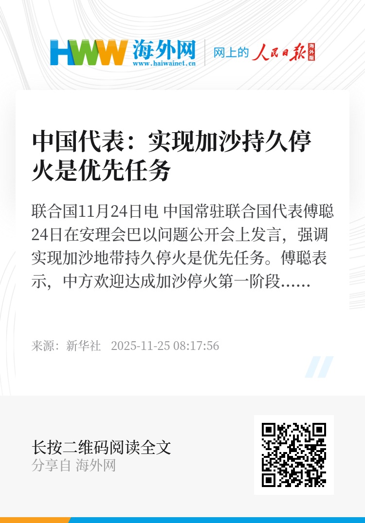 新华社联合国11月24日电 中国常驻联合国代表傅聪24日在安理会巴以问题公开会上发言,强调实现加沙地带持久停火是优先任务。