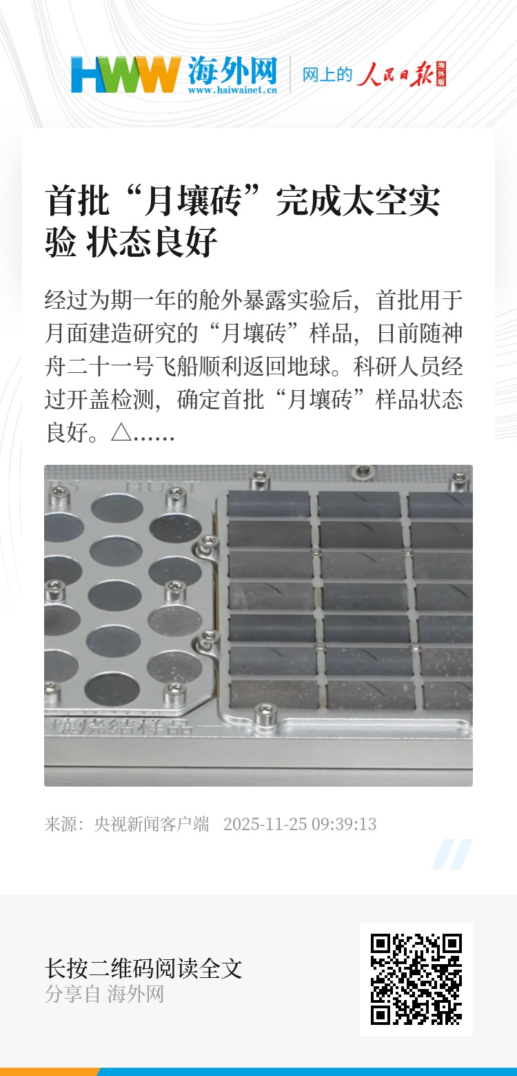 经过为期一年的舱外暴露实验后,首批用于月面建造研究的“月壤砖”样品,日前随神舟二十一号飞船顺利返回地球。科研人员经过开盖检测,确定首批“月壤砖”样品状态良好。