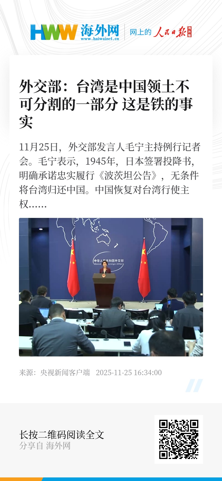 毛宁表示,1945年,日本签署投降书,明确承诺忠实履行《波茨坦公告》,无条件将台湾归还中国。中国恢复对台湾行使主权,从法律和事实上收复了台湾。1949年中华人民共和国政府取代中华民国政府,这是在中国国际法主体没有发生变化情况下的政权更替,中国的主权和固有领土疆域没有改变。中华人民共和国政府理所当然完全享有和行使中国的主权,包括对台湾的主权。1972年《中日联合声明》明确,日本国政府承认中华人民共和国政府是中国的唯一合法政府。