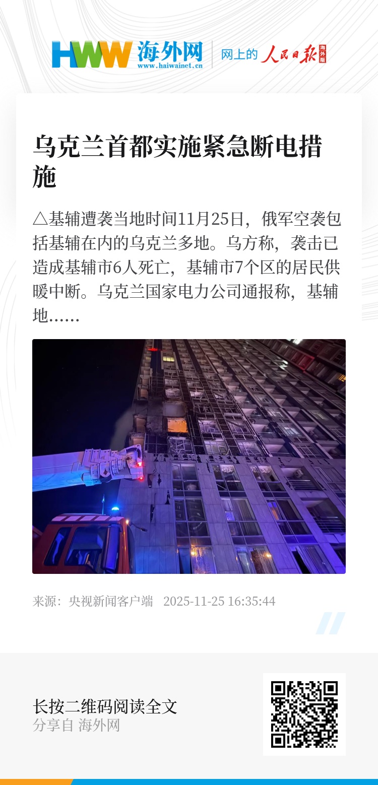 当地时间11月25日,俄军空袭包括基辅在内的乌克兰多地。乌方称,袭击已造成基辅市6人死亡,基辅市7个区的居民供暖中断。乌克兰国家电力公司通报称,基辅地区已实施紧急断电措施。