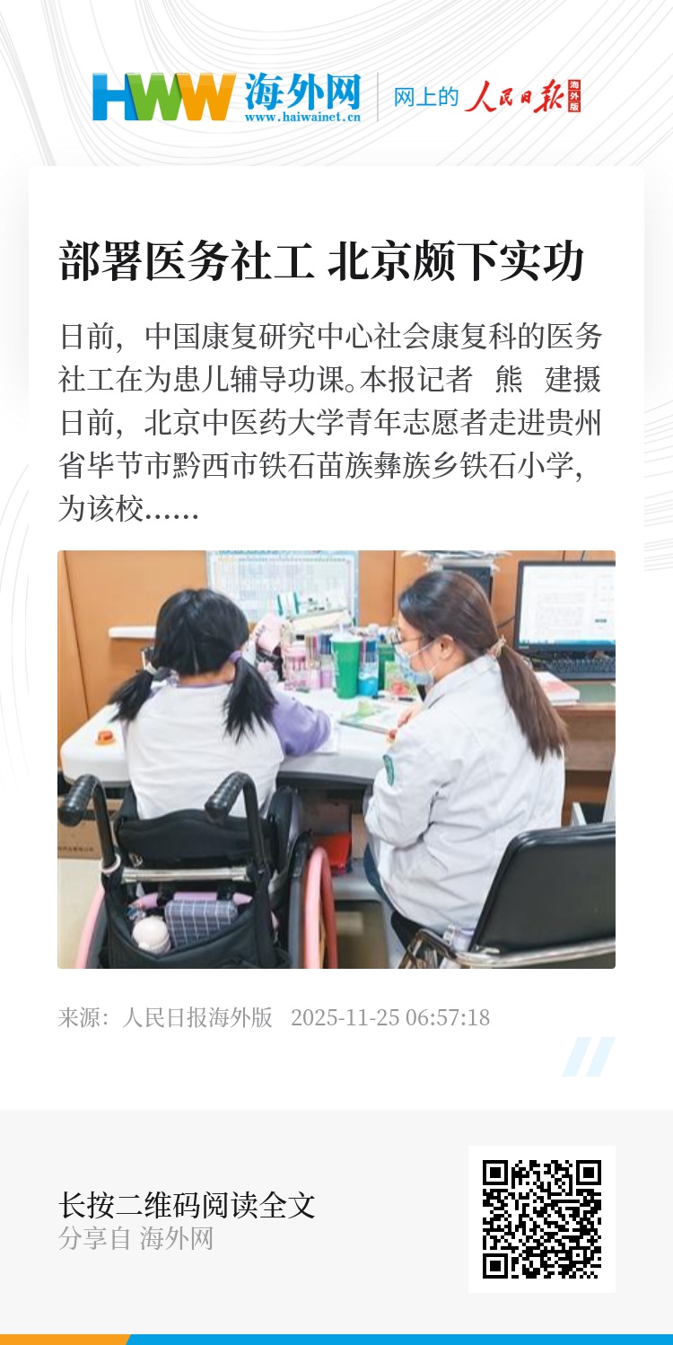 徐长顺:的确,医务社工理念源自西方。中国医务社会工作的发展最早可追溯到20世纪初,那时在北京的协和、湖南的雅礼(后更名湘雅医院)等都有过医务社会工作服务,帮助过无数正在经历病痛的人们。伴随着健康中国战略实施,我们在推进中特别注重结合北京实际本土化改造。一方面从中医“仁爱”思想中汲取智慧,另一方面运用党的群众工作方法,让专业服务更接北京地气。