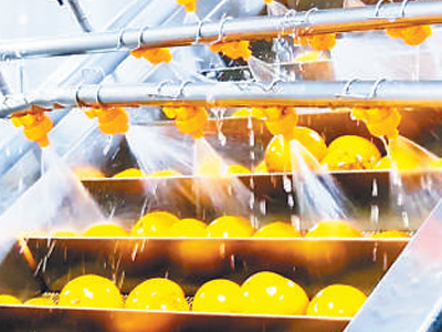 在浙江艾佳果蔬开发有限责任公司,胡柚正在生产线上进行清洗。