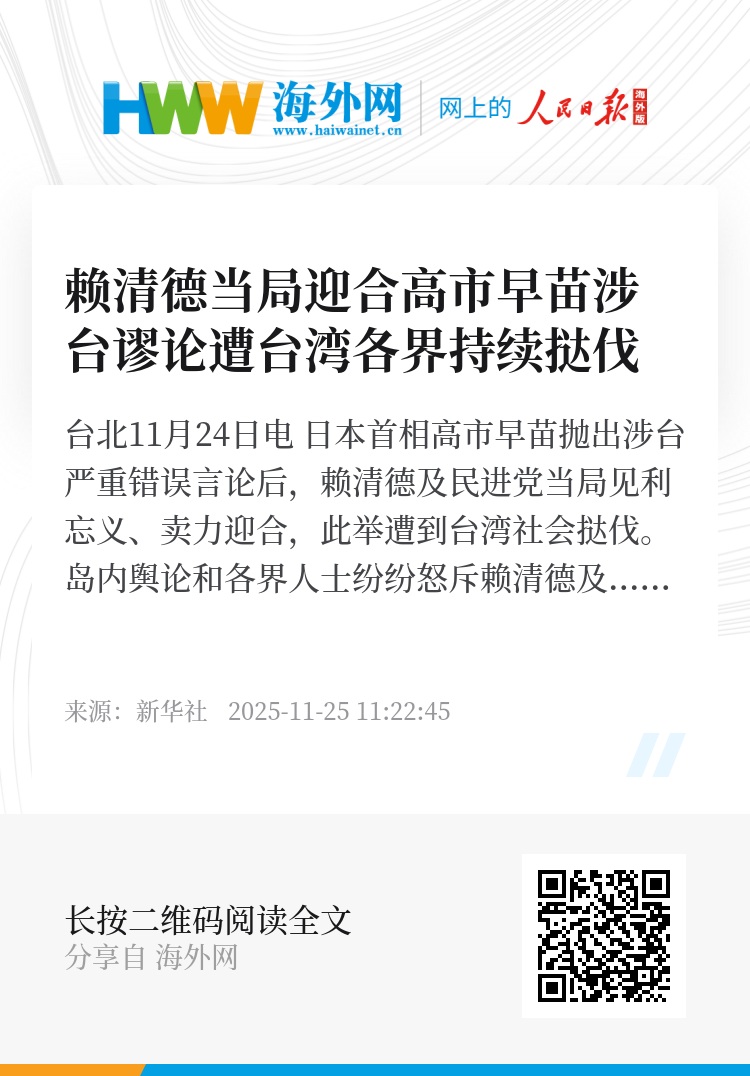 新华社台北11月24日电 日本首相高市早苗抛出涉台严重错误言论后,赖清德及民进党当局见利忘义、卖力迎合,此举遭到台湾社会挞伐。岛内舆论和各界人士纷纷怒斥赖清德及民进党当局背弃民族立场,与日本右翼分子狼狈为奸,为一己私利大肆媚日舔日跪日,不顾是非曲直和百姓安危,只会把台湾推向更危险境地。