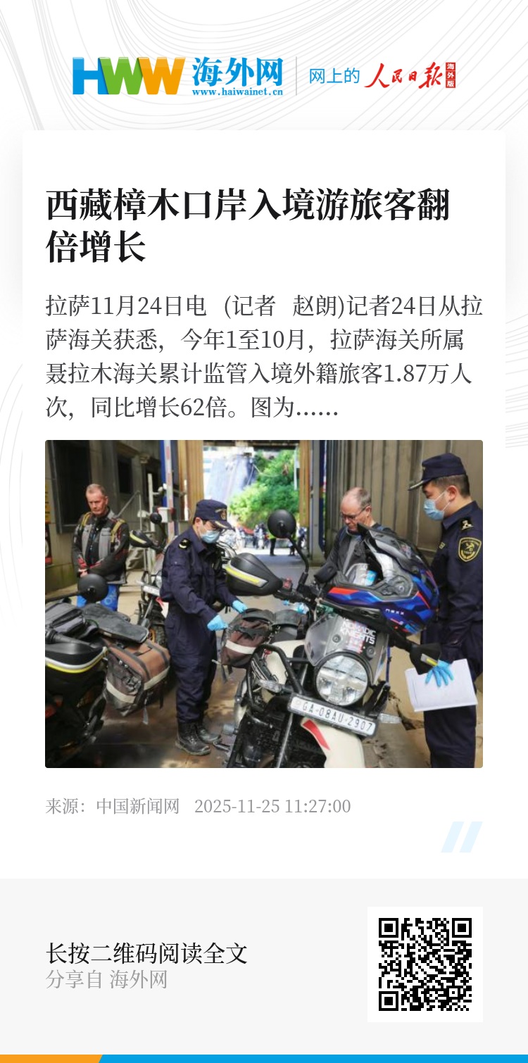 据悉,近年来,随着“一带一路”倡议的深入实施,以及入境免签政策红利不断释放,西藏樟木口岸“接待”了越来越多的来藏从事贸易、游玩打卡的国际面孔……前不久,在拉萨海关所属聂拉木海关监管下,来自欧亚6国的24名摩友组成的摩托车自驾车队,通过樟木口岸入境前往日喀则、拉萨、林芝等地旅行。