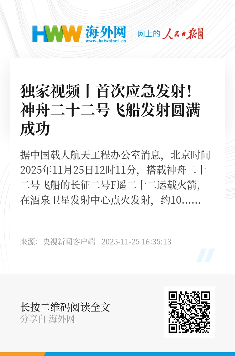 据中国载人航天工程办公室消息,北京时间2025年11月25日12时11分,搭载神舟二十二号飞船的长征二号F遥二十二运载火箭,在酒泉卫星发射中心点火发射,约10分钟后,飞船与火箭成功分离并进入预定轨道,发射任务取得圆满成功。飞船入轨后,将按照预定程序与空间站组合体进行自主快速交会对接。