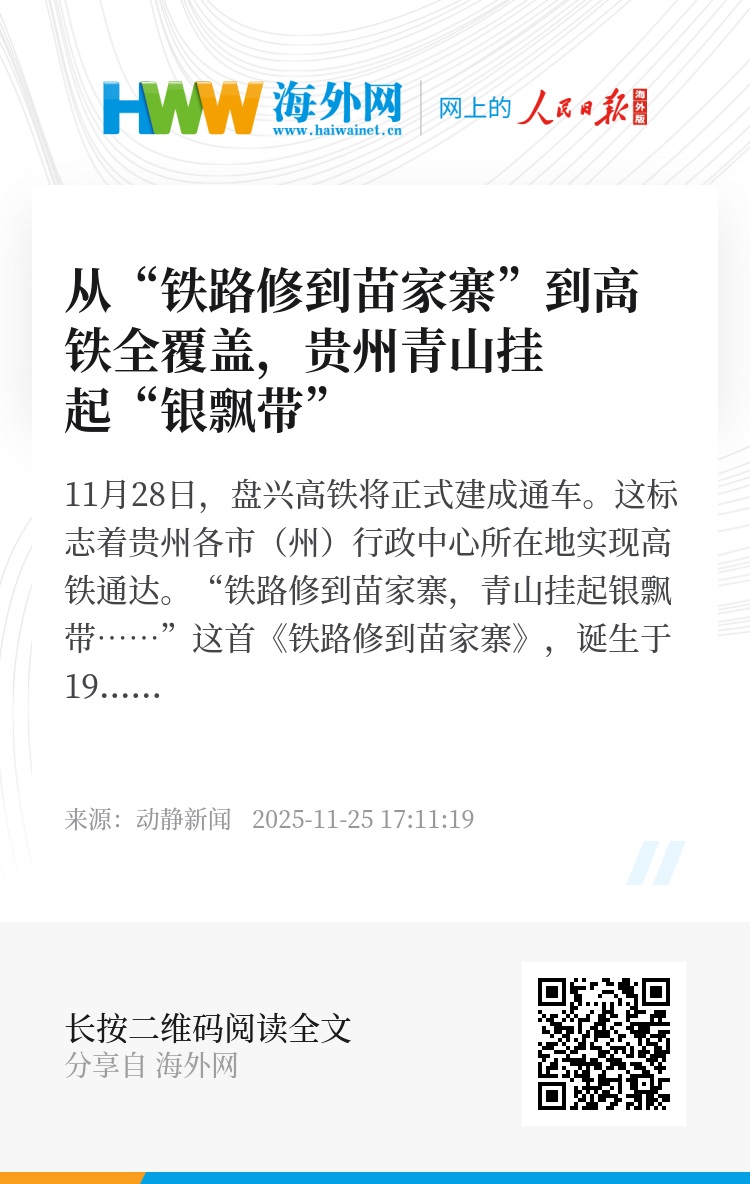 青山依旧在,而这片土地的发展轨迹已被高铁重新绘就——一条条“银飘带”不仅穿山越岭,更连起了机遇与希望。这场巨变,既为谱写中国式现代化贵州实践新篇章提供坚实支撑,更是其磅礴进程的精彩缩影。(张鸿杰)
