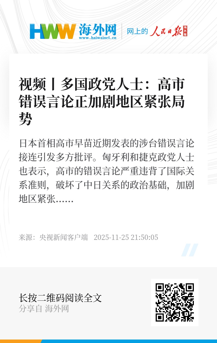 日本首相高市早苗近期发表的涉台错误言论接连引发多方批评。匈牙利和捷克政党人士也表示,高市的错误言论严重违背了国际关系准则,破坏了中日关系的政治基础,加剧地区紧张局势,国际社会对此强烈反对。、