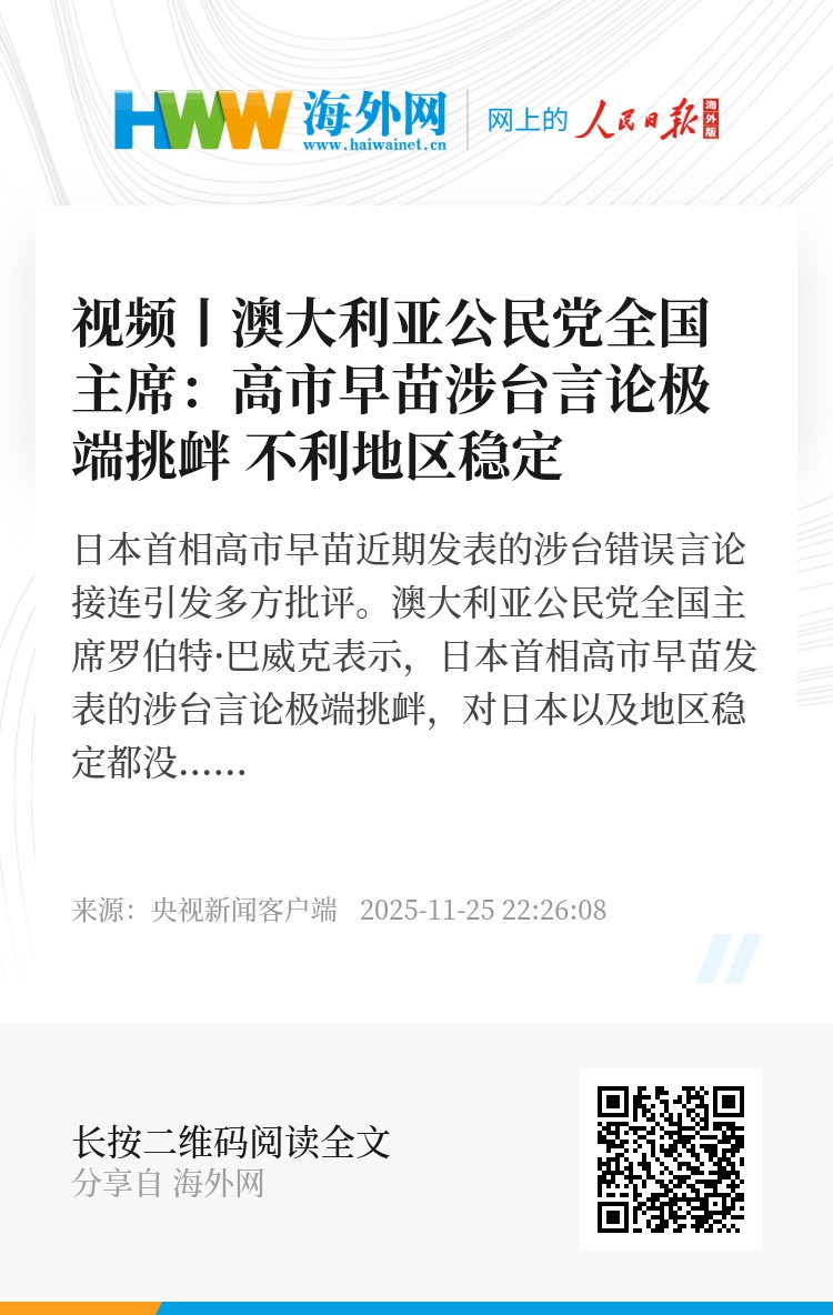 日本首相高市早苗近期发表的涉台错误言论接连引发多方批评。澳大利亚公民党全国主席罗伯特·巴威克表示,日本首相高市早苗发表的涉台言论极端挑衅,对日本以及地区稳定都没有好处。