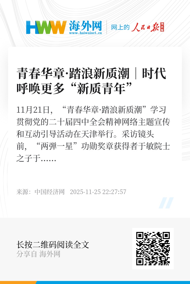 11月21日,“青春华章·踏浪新质潮”学习贯彻党的二十届四中全会精神网络主题宣传和互动引导活动在天津举行。采访镜头前,“两弹一星”功勋奖章获得者于敏院士之子于辛、中国社会科学院学部委员张翼和天津大学动力机械及工程专业博士研究生陈煜畅谈他们眼中的新时代青年,共话为发展新质生产力贡献青春力量。(中国经济网记者:马常艳 臧梦雅 视频剪辑:赵世楠)