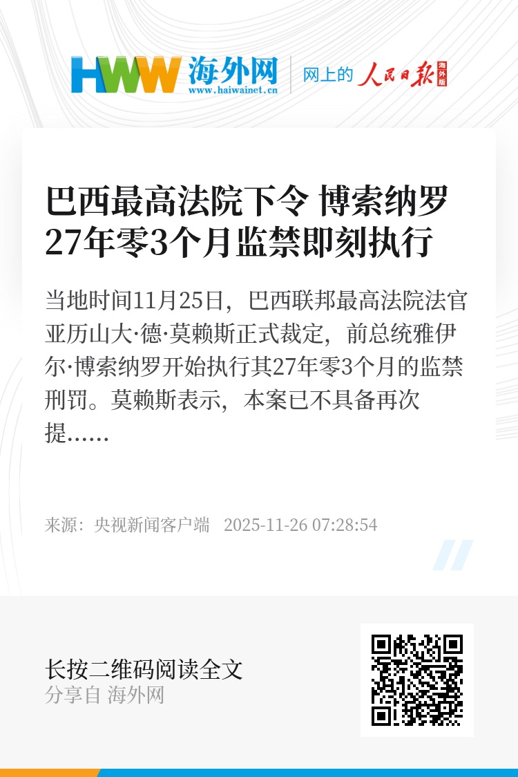 当地时间11月25日,巴西联邦最高法院法官亚历山大·德·莫赖斯正式裁定,前总统雅伊尔·博索纳罗开始执行其27年零3个月的监禁刑罚。莫赖斯表示,本案已不具备再次提起上诉的法律条件。根据裁决,博索纳罗将继续被关押在巴西利亚联邦警察局的高级别羁押设施内,他自本月22日起已被预防性拘押,并将在同一地点开始服刑。莫赖斯在当天的决定中指出,博索纳罗的辩护团队未能在11月24日规定期限内提交新的动议,按照现行法律规定,本案不再允许提出任何形式的上诉。