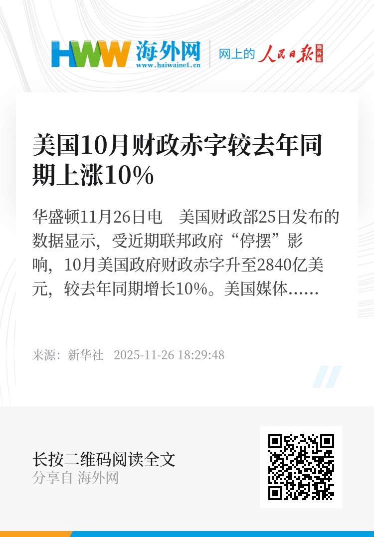 新华社华盛顿11月26日电 美国财政部25日发布的数据显示,受近期联邦政府“停摆”影响,10月美国政府财政赤字升至2840亿美元,较去年同期增长10%。