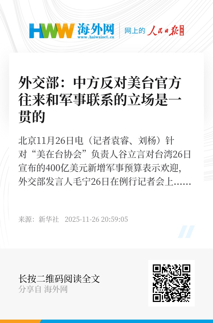 新华社北京11月26日电(记者袁睿、刘杨)针对“美在台协会”负责人谷立言对台湾26日宣布的400亿美元新增军事预算表示欢迎,外交部发言人毛宁26日在例行记者会上答问时表示,中方反对美台官方往来和军事联系的立场是一贯的。台湾民进党当局“以武拒统”“以武谋独”不可能得逞。