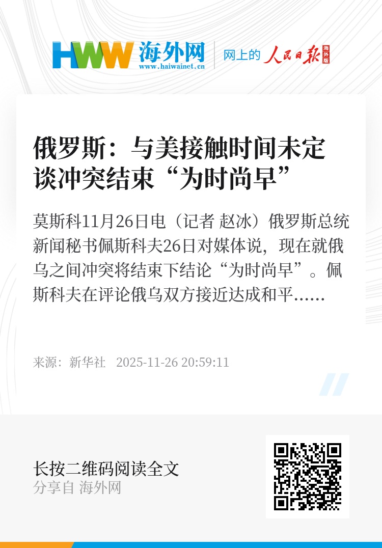 新华社莫斯科11月26日电(记者 赵冰)俄罗斯总统新闻秘书佩斯科夫26日对媒体说,现在就俄乌之间冲突将结束下结论“为时尚早”。