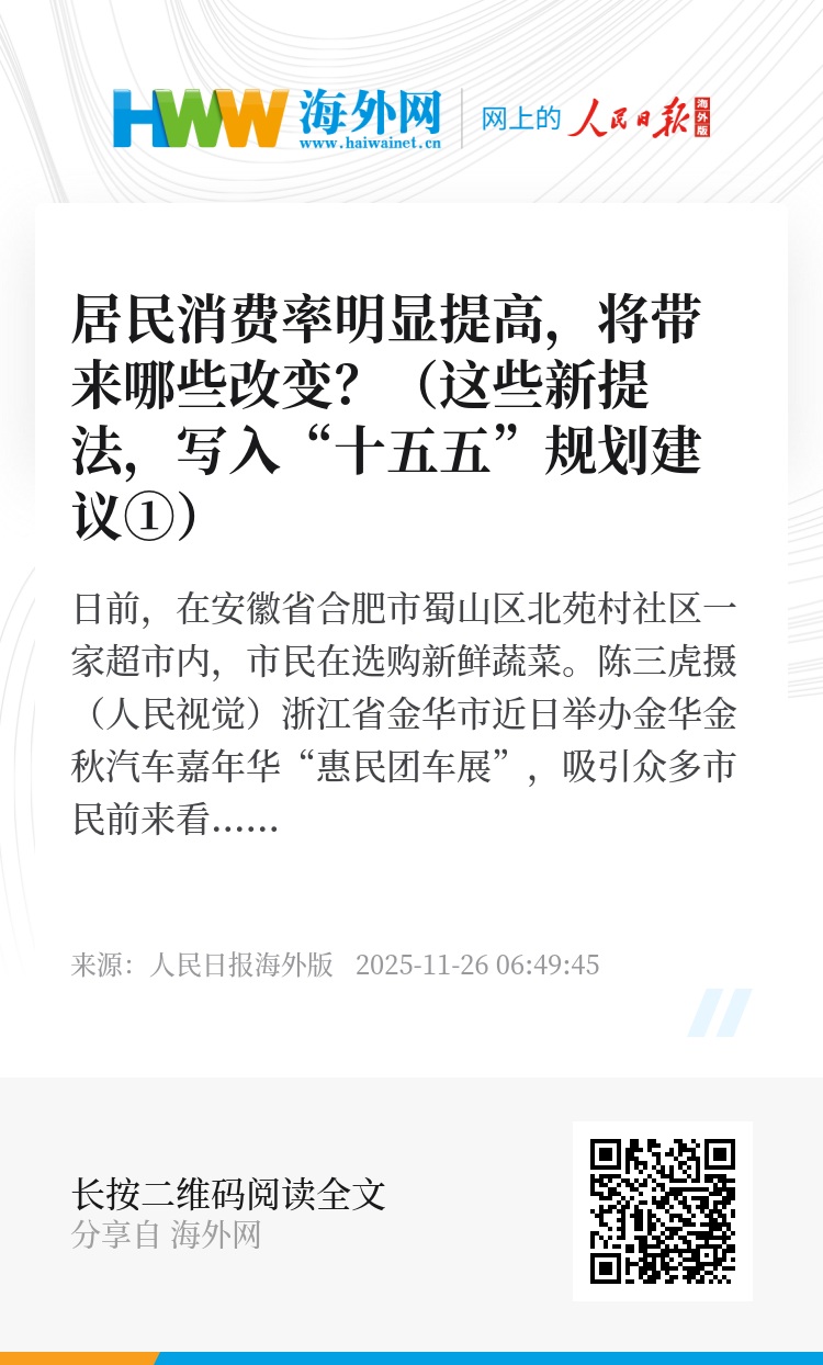 “中国官方提出明显提高居民消费率”“中国将形成更多由内需主导、消费拉动、内生增长的经济发展模式”——“十五五”规划建议发布以来,多家外媒持续关注其中有关消费的新提法。