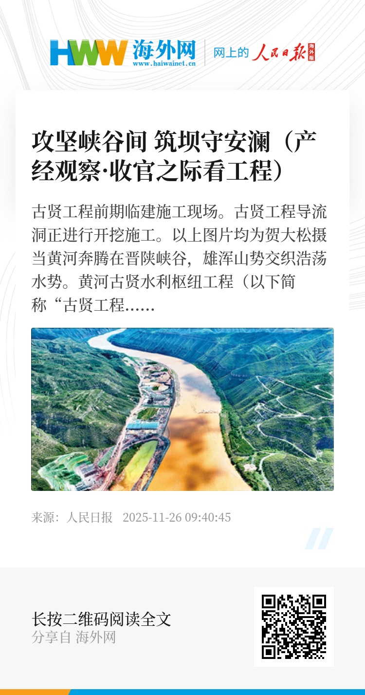 从九曲黄河视之,古贤工程将与龙羊峡、刘家峡、小浪底等骨干枢纽携手,调泥沙、护安澜、保供水、发绿电。