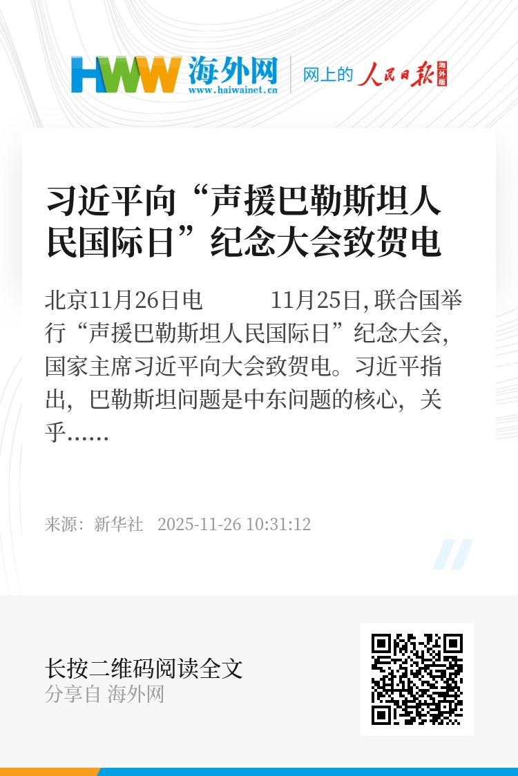 新华社北京11月26日电 11月25日,联合国举行“声援巴勒斯坦人民国际日”纪念大会,国家主席习近平向大会致贺电。