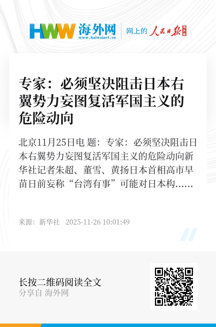日本首相高市早苗日前妄称“台湾有事”可能对日本构成“存亡危机事态”,暗示可能以行使所谓“集体自卫权”为由,武力介入台湾问题,性质影响极其恶劣,引起中国人民强烈愤慨和各国有识之士广泛反对。专家表示,国际社会必须高度警惕日本借“台湾有事就是日本有事”公然破坏战后国际秩序、复活军国主义的危险动向。