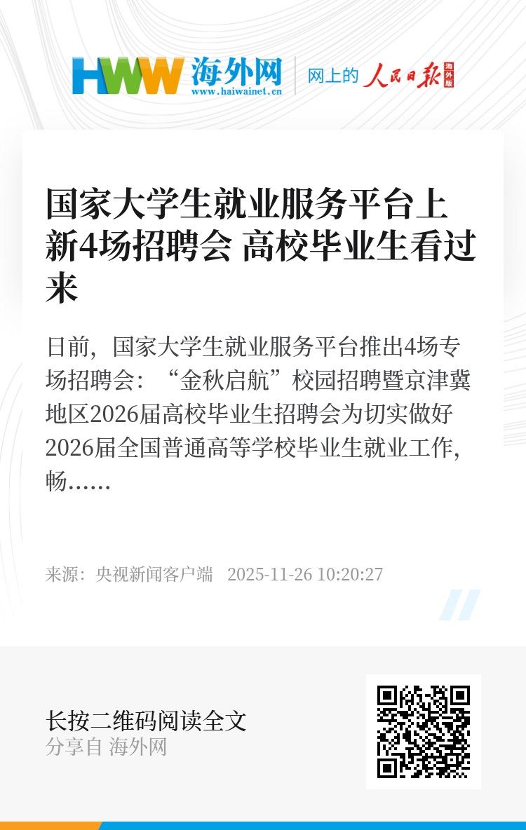 为扎实做好毕业生就业工作,助力2026届高校毕业生高质量充分就业,各高校共同举办中西部、东北部高校“共享就业”2025年冬季线上联合双选会。活动预计提供岗位2.1万余个,持续时间至2026年3月31日。