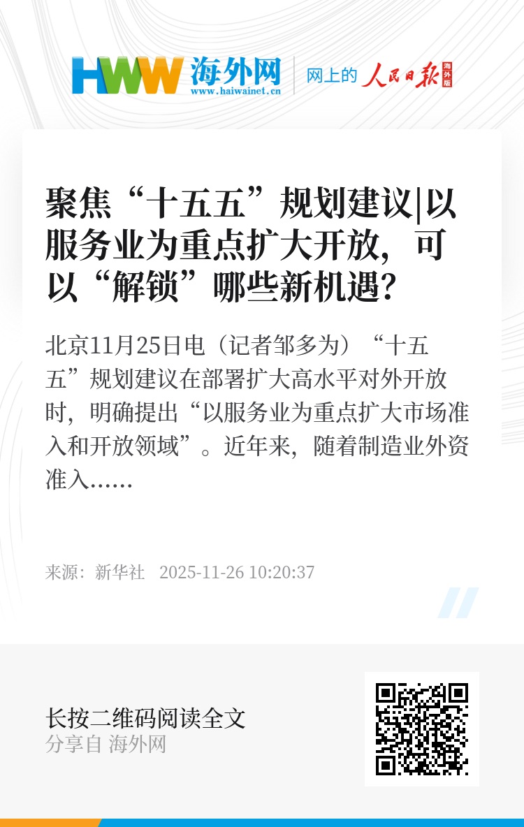 新华社北京11月25日电(记者邹多为)“十五五”规划建议在部署扩大高水平对外开放时,明确提出“以服务业为重点扩大市场准入和开放领域”。