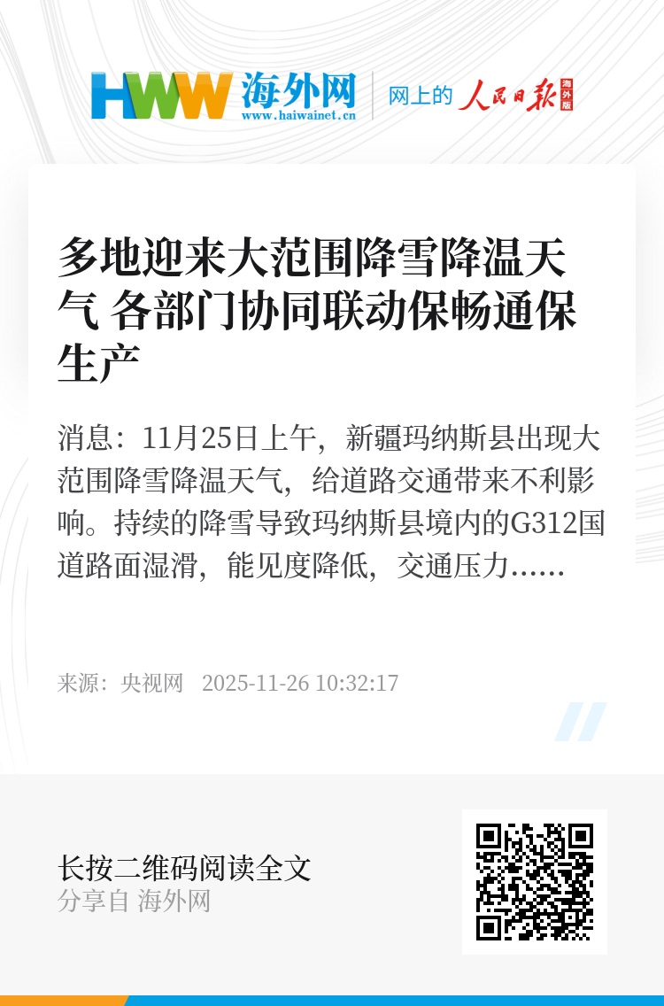 央视网消息:11月25日上午,新疆玛纳斯县出现大范围降雪降温天气,给道路交通带来不利影响。