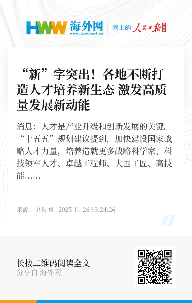 央视网消息:人才是产业升级和创新发展的关键。“十五五”规划建议提到,加快建设国家战略人才力量,培养造就更多战略科学家、科技领军人才、卓越工程师、大国工匠、高技能人才等各类人才。各地也不断推出新举措,打造人才培养新生态,激活发展新动能。