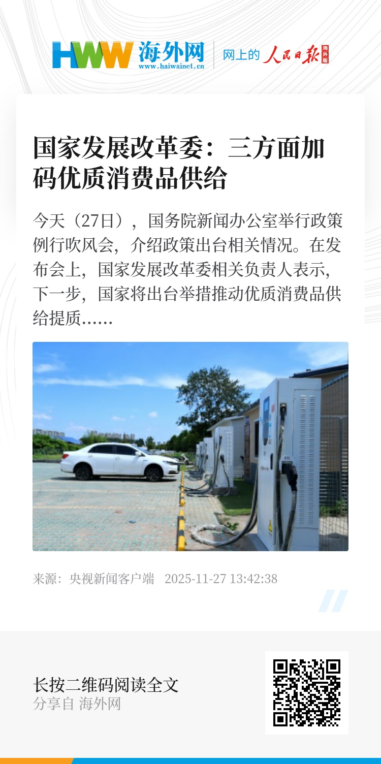 今天(27日),国务院新闻办公室举行政策例行吹风会,介绍政策出台相关情况。在发布会上,国家发展改革委相关负责人表示,下一步,国家将出台举措推动优质消费品供给提质扩容,为消费增长注入强劲动力。