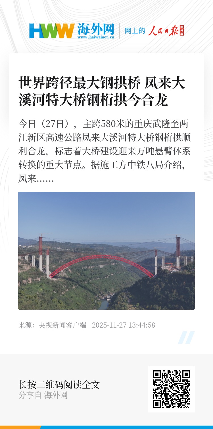 今日(27日),主跨580米的重庆武隆至两江新区高速公路凤来大溪河特大桥钢桁拱顺利合龙,标志着大桥建设迎来万吨悬臂体系转换的重大节点。