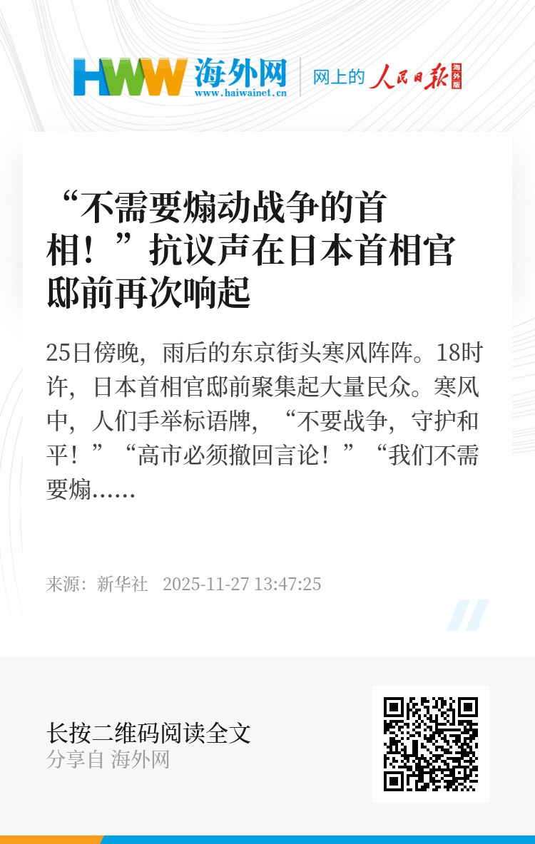 另一名女性抗议者告诉记者,“战争会彻底摧毁一个人的生活,还会影响下一代、下下一代”。她停顿许久说道:“我真不明白高市为什么会说出那样的话,她到底接受了怎样的教育才会有那样的思维?”