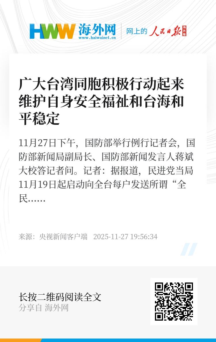 记者:据报道,民进党当局11月19日起启动向全台每户发送所谓“全民国防手册”,称此举旨在增加民众对包括中国大陆可能对台军事行动在内的各种紧急情况的准备。民进党当局有官员称,这是在展现“台湾自我防卫决心”,让两岸人民都知道如果大陆“作出错误决定”必须付出巨大代价。请问发言人对此有何评论?