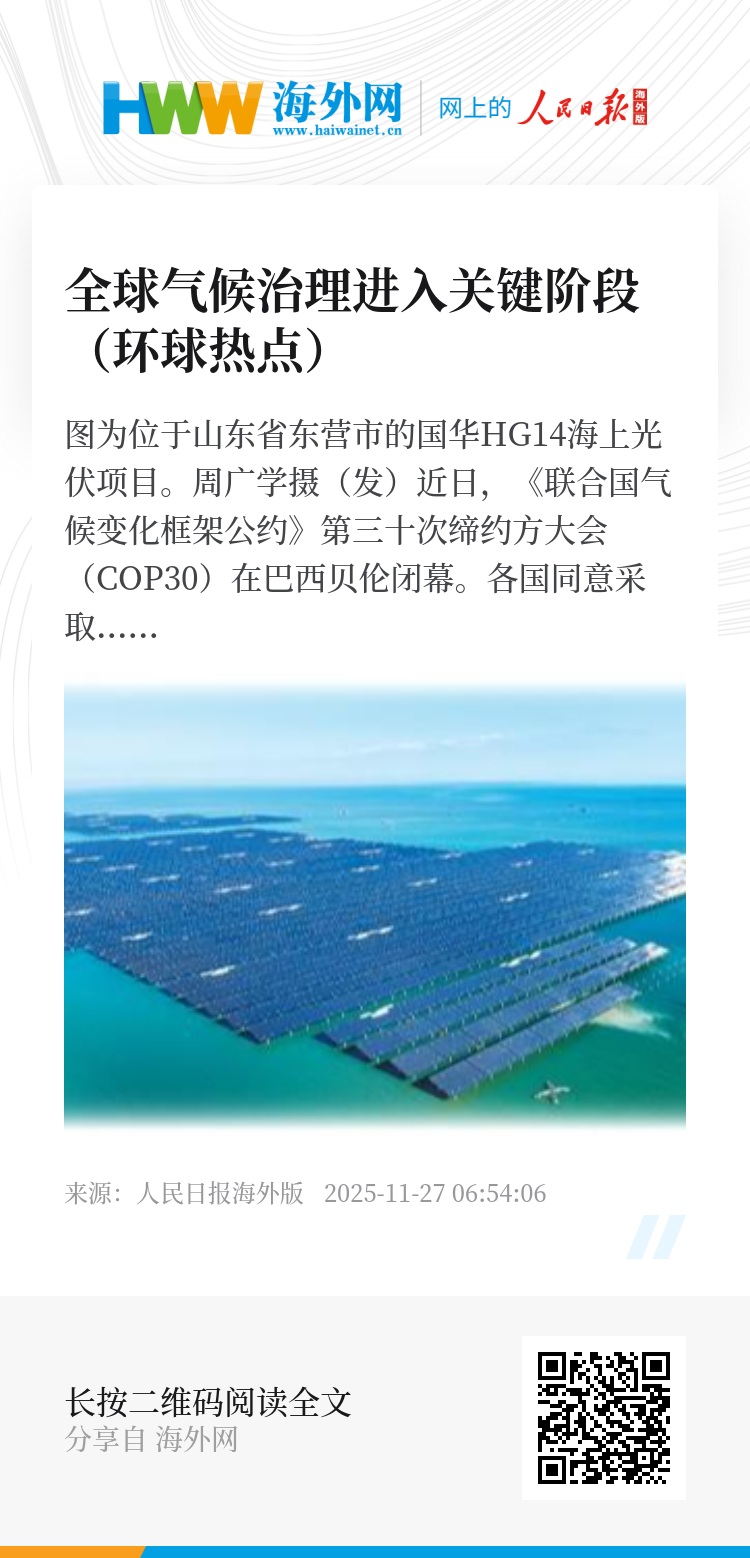 据报道,COP30通过的总体协议呼吁各国更加主动地推进减排和适应行动。协议提出,到2035年前,富裕国家应将支持发展中国家的气候资金提高两倍,以帮助后者应对不断加剧的气候风险。协议还指出,全球贸易壁垒正在限制清洁能源技术的使用,相关机构应研究如何让国际贸易规则更好地支持气候行动。