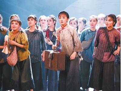 “船底舱”是全剧的重要场面。在黑暗逼仄的船底舱里,女子们蜷缩在最底层。船板上方一个小小的窟窿就是黑暗中的微风和希望,女子们在手的舞动中承载“向往”与“飞翔”。用音乐宣叙调组织领唱、独吟和群唱,抒发情感的丰沛张力。