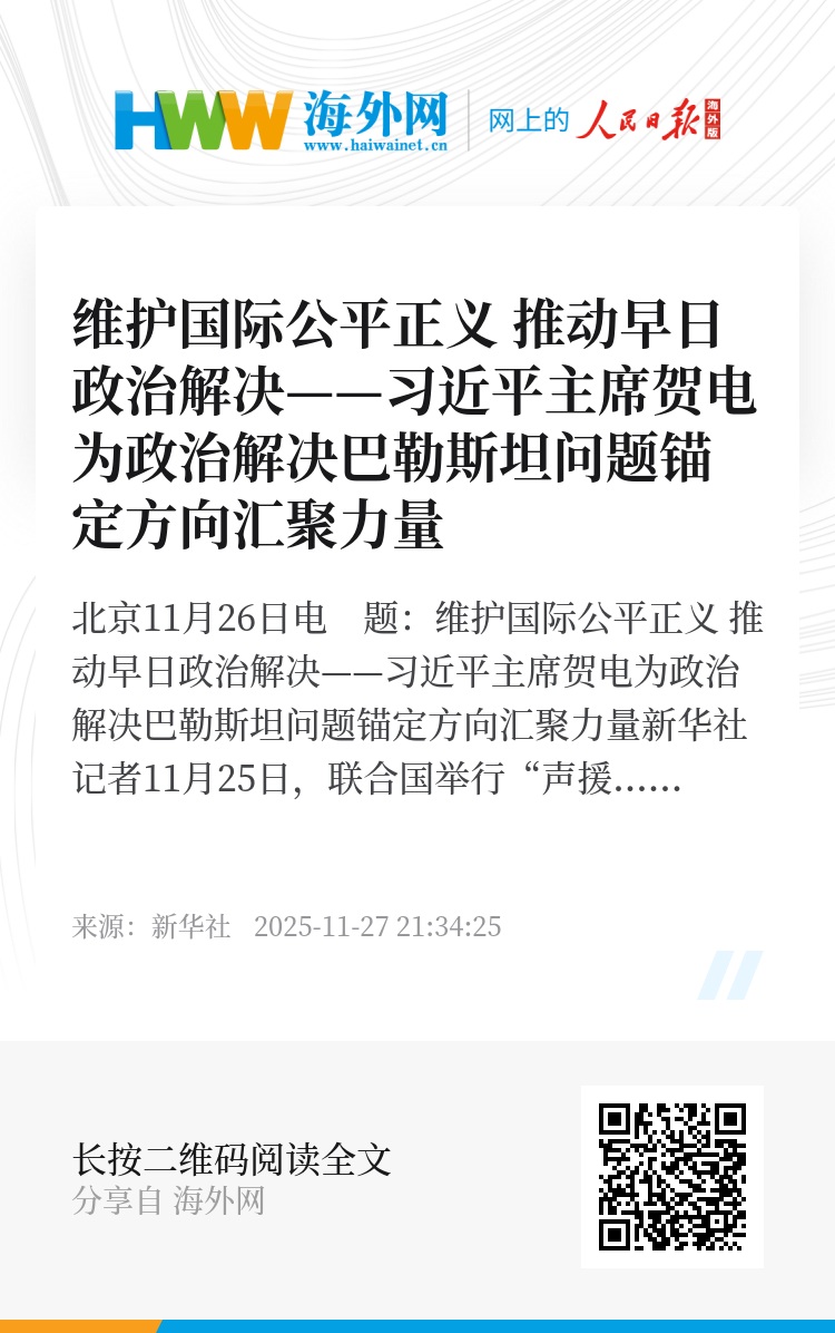 新华社北京11月26日电 题:维护国际公平正义 推动早日政治解决——习近平主席贺电为政治解决巴勒斯坦问题锚定方向汇聚力量