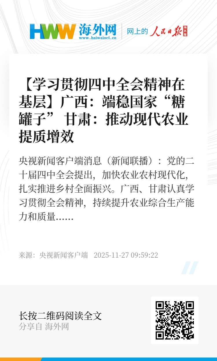 央视新闻客户端消息(新闻联播):党的二十届四中全会提出,加快农业农村现代化,扎实推进乡村全面振兴。广西、甘肃认真学习贯彻全会精神,持续提升农业综合生产能力和质量效益,为加快建设农业强国贡献力量。