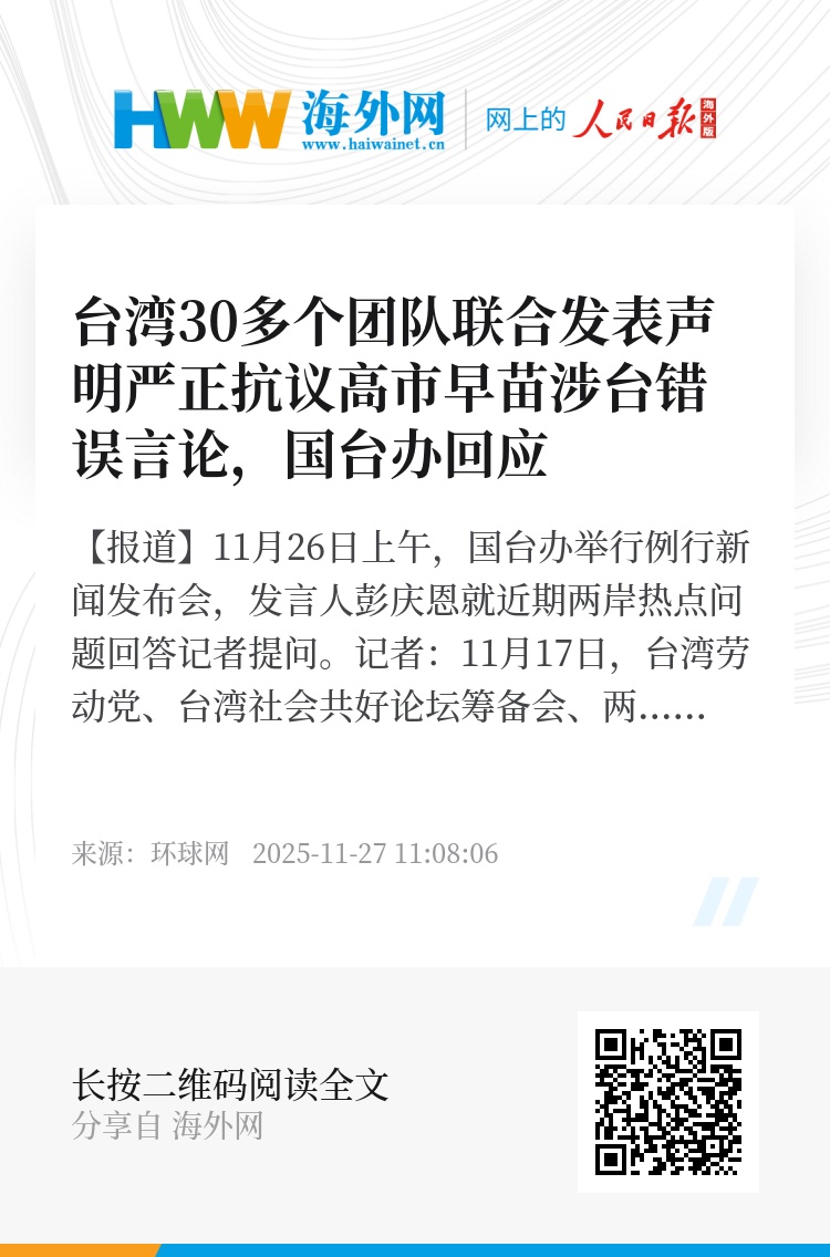 记者:11月17日,台湾劳动党、台湾社会共好论坛筹备会、两岸和平发展论坛等30多个团队联合发表声明,严正抗议高市早苗涉台错误言论,表示台湾人民拒当日本军国主义牺牲品;要求高市早苗立即撤回涉台妄言,并向台湾人民、琉球人民与区域国家公开道歉。对此有何评论?