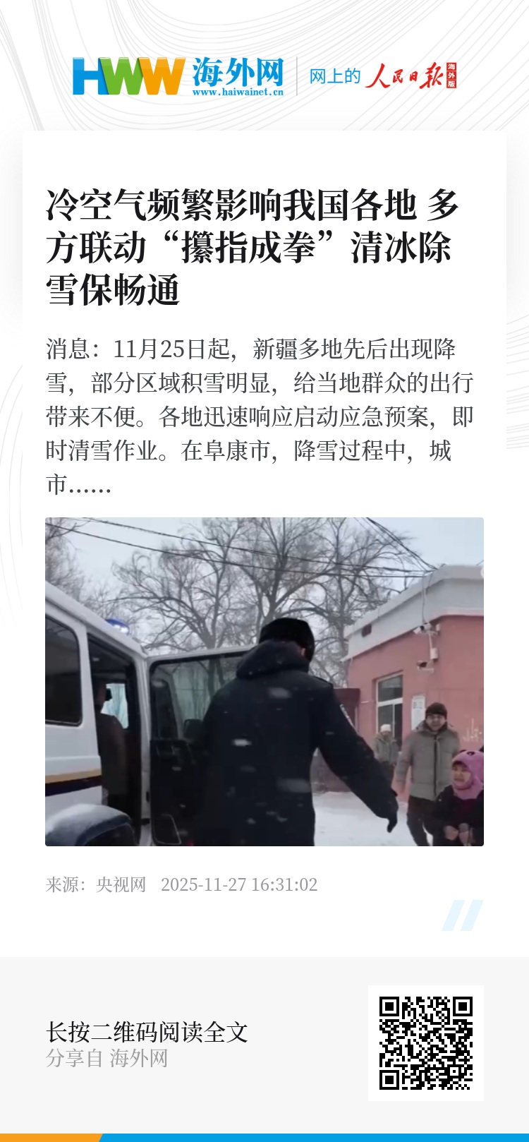 央视网消息:11月25日起,新疆多地先后出现降雪,部分区域积雪明显,给当地群众的出行带来不便。各地迅速响应启动应急预案,即时清雪作业。