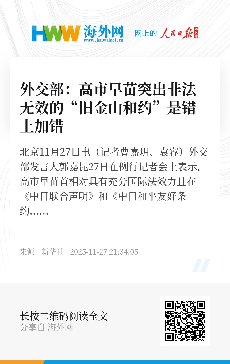 新华社北京11月27日电(记者曹嘉玥、袁睿)外交部发言人郭嘉昆27日在例行记者会上表示,高市早苗首相对具有充分国际法效力且在《中日联合声明》和《中日和平友好条约》等双边文件中明确强调的《开罗宣言》《波茨坦公告》避而不谈,却唯一突出非法无效的“旧金山和约”,这再次表明,她时至今日仍不思悔改,仍在持续损害中日四个政治文件精神确定的中日关系政治基础,无视联合国权威,公然挑战战后国际秩序和国际法基本准则,甚至妄图煽炒所谓“台湾地位未定论”。这是错上加错,中方对此坚决反对,国际社会也应高度警惕。中方再次敦促日方切实反思纠错,收回错误言论,以实际行动体现对华承诺,以实际行动履行作为联合国成员国起码应尽的义务。