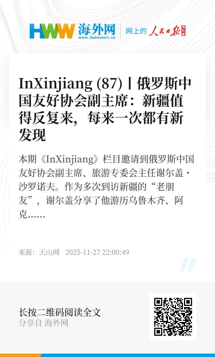 本期《InXinjiang》栏目邀请到俄罗斯中国友好协会副主席、旅游专委会主任谢尔盖・沙罗诺夫。作为多次到访新疆的“老朋友”,谢尔盖分享了他游历乌鲁木齐、阿克苏、和田、伊宁等多地的亲身经历,盛赞赛里木湖的壮美风光、那拉提草原的自然之美,更提及了家人尤其是孩子对新疆的喜爱。