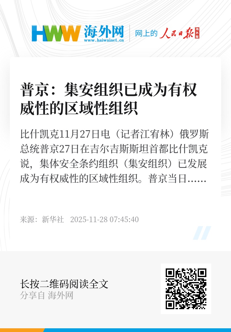 新华社比什凯克11月27日电(记者江宥林)俄罗斯总统普京27日在吉尔吉斯斯坦首都比什凯克说,集体安全条约组织(集安组织)已发展成为有权威性的区域性组织。